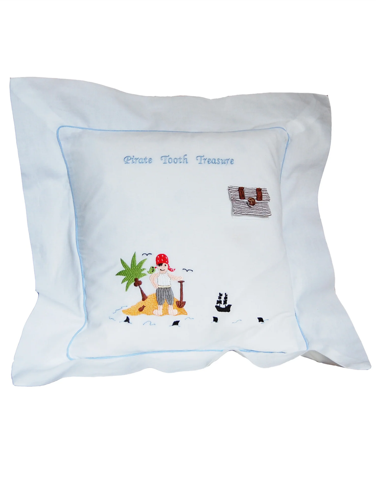 Pirate Tooth Fairy Cushion Cover measures 12" with colourful pirate embroidery and treasure chest, complete with a buttoned pocket for the tooth. Features an Oxford edge and blue piping.