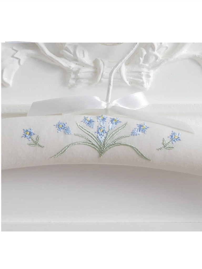 Beautiful padded Coat Hangers, with pale blue embroidered flowers and green leaves across the front, finished with a white bow, the perfect gift to accompany a lovely nightdress.