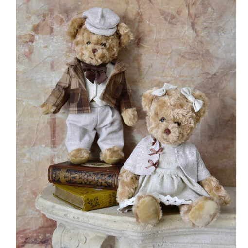 Teddy is looking very smart in his brown tartan jacket and matching flat cap, natural coloured trousers, a linen waistcoat with a dicky bow tie. Teddy is super cuddly, with velvety paws, fixed eyes, jointed legs, an embroidered nose and mouth.