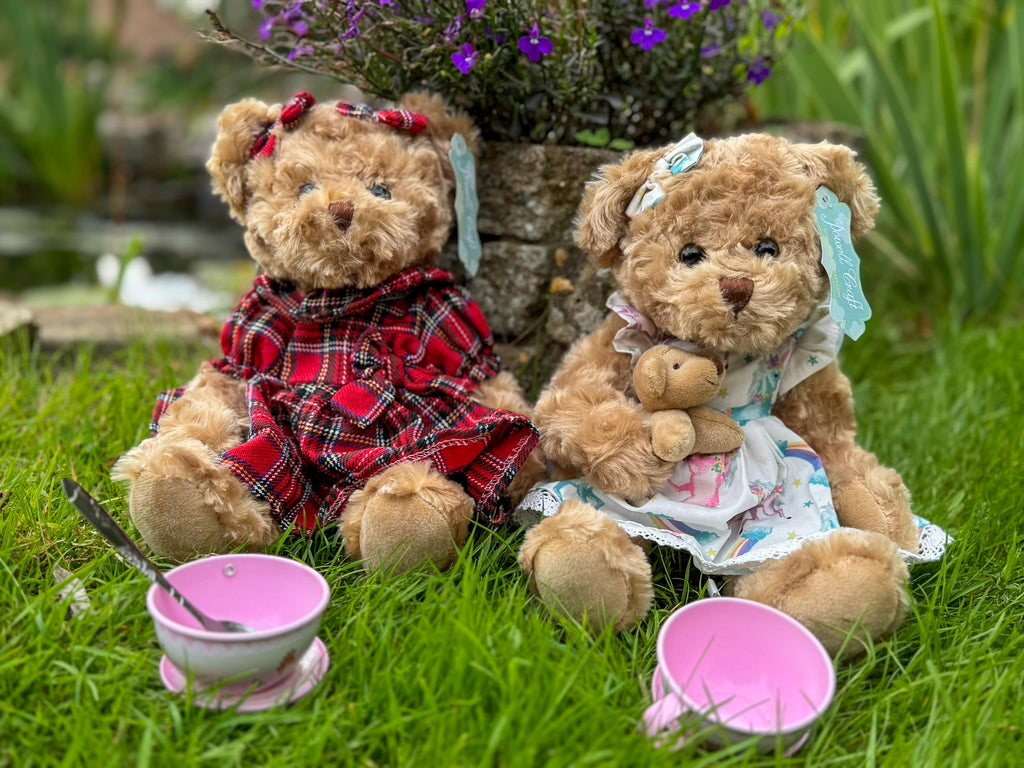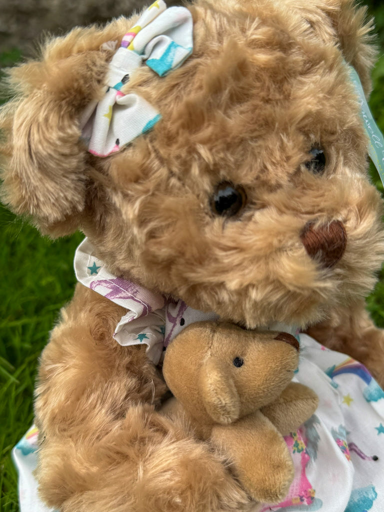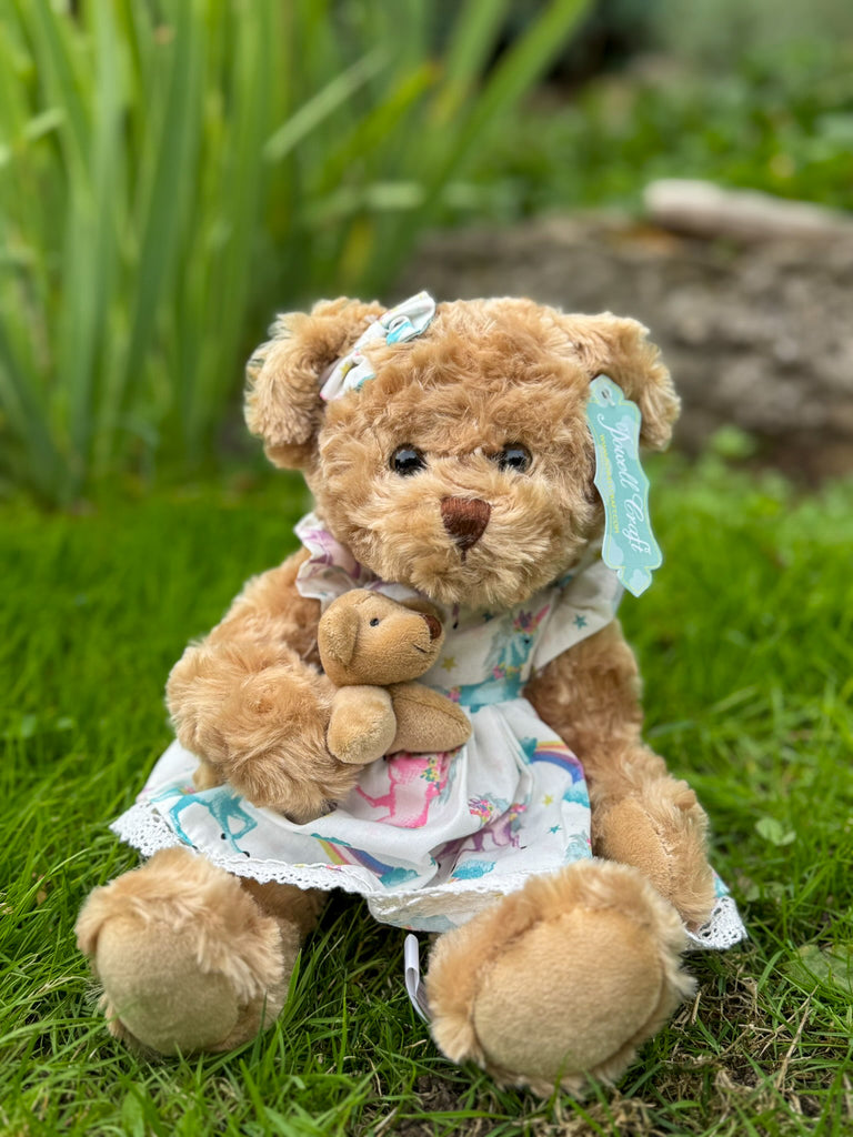 This delightful, cuddly, and super soft teddy bear has velvety paws, fixed eyes, and jointed legs, with an embroidered mouth and nose. Teddy is wearing a Unicorn print dress trimmed with lace around the hem, with a velcro opening at the back, and to finish her outfit, she has a matching bow in her hair and is holding her little bear.